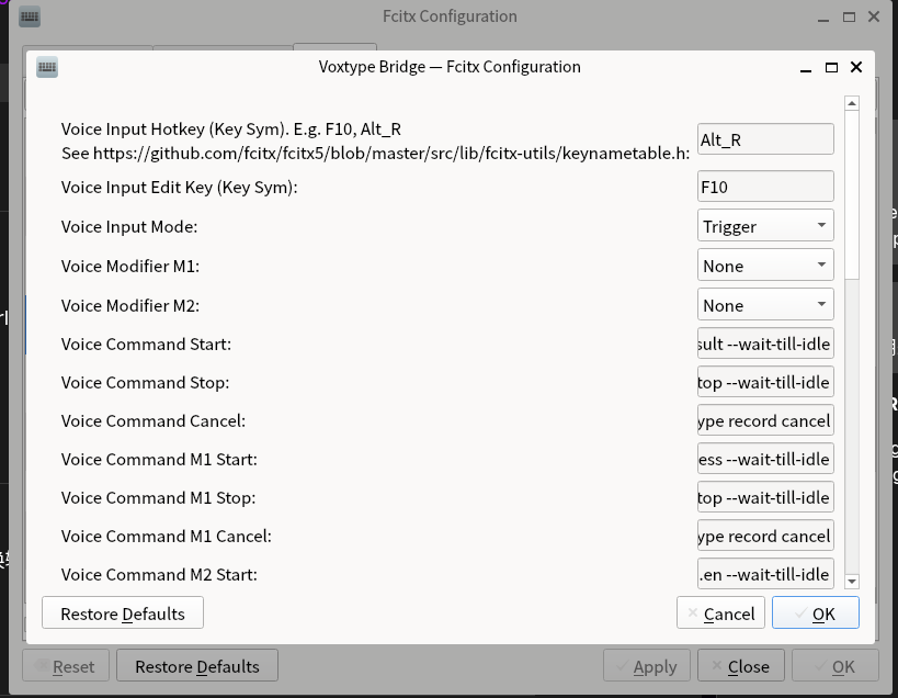 - 在输入法可以使用(比如在输入框内)时,禁用 voxtype daemon 的键检测。这样就可以让 voxtype 和输入法配置同样的热键了,优先使用输入法。